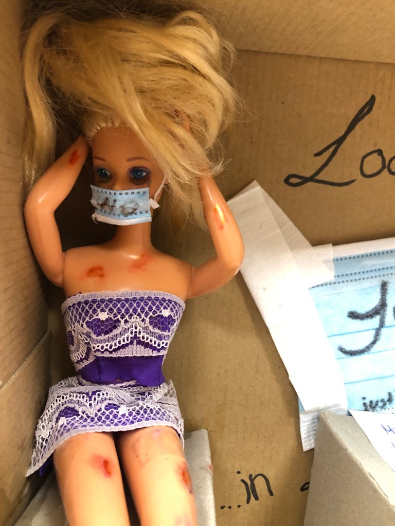 Man sieht eine Frau mit blauem Auge, Wunden, blauen Flecken und einer Träne. Es soll darstellen, dass Frauen im Lockdown verpflichtet waren, zuhause zu sein – in einem Zuhause, was nicht wirklich ein Zuhause ist. Viele Frauen müssen unter häuslicher Gewalt leiden oder werden gezwungen, eine Hausfrau zu sein, zu kochen, zu putzen und sich allein um die Kinder zu kümmern.