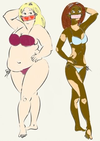 „Das Bild zeigt zwei Frauen. Eine Dickere und eine Dünne. Um zu zeigen, dass sich die Vielfalt der Körper nicht nur im Körpergewicht zeigt, ist die dünnere Frau dunkelhäutig und hat helle Pigmentflecken auf der Haut. Im Corona-Lockdown haben viele Menschen zu- oder abgenommen und für viele ist diese Veränderung des Körpergewichts auch jetzt, nach dem Lockdown, noch ein Thema. Mein Appell ist: Man ist nie hässlich!“